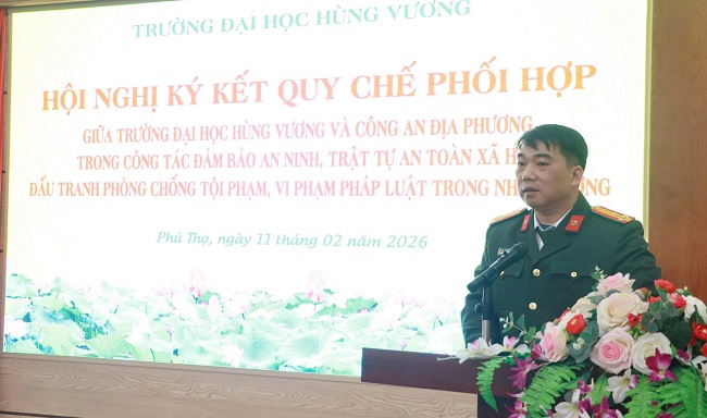 Chiều ngày 11/02/2026, tại Trường Đại học Hùng Vương đã diễn ra Hội nghị ký kết Quy chế phối hợp giữa Nhà trường và công an địa phương.