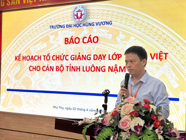 TS. Hà Ngọc Phú - Phó trưởng Phòng Đào tạo báo cáo kế hoạch tổ chức giảng dạy lớp Tiếng Việt cho cán bộ tỉnh Luông Nậm Thà