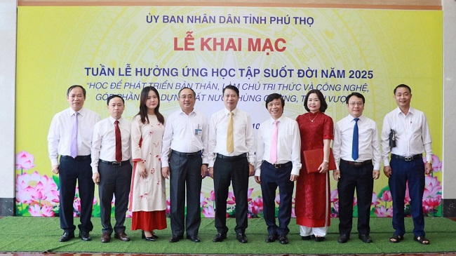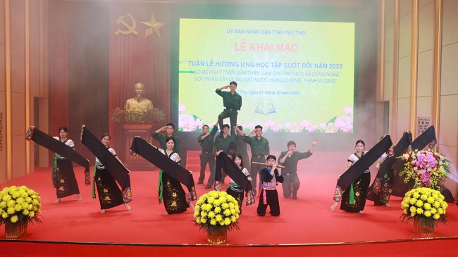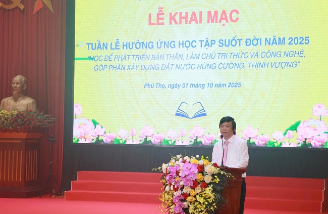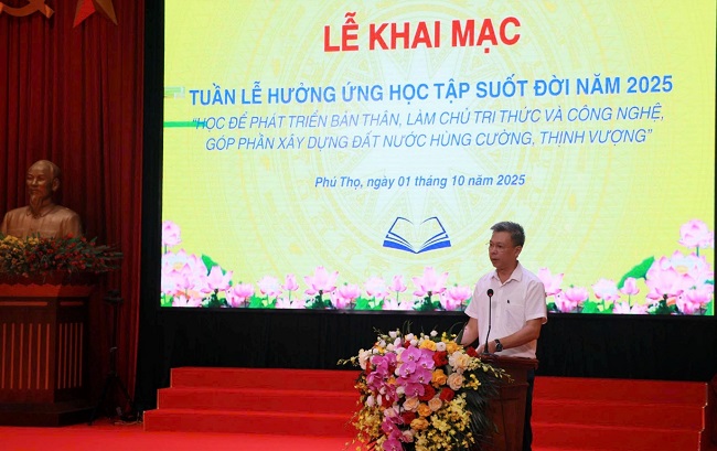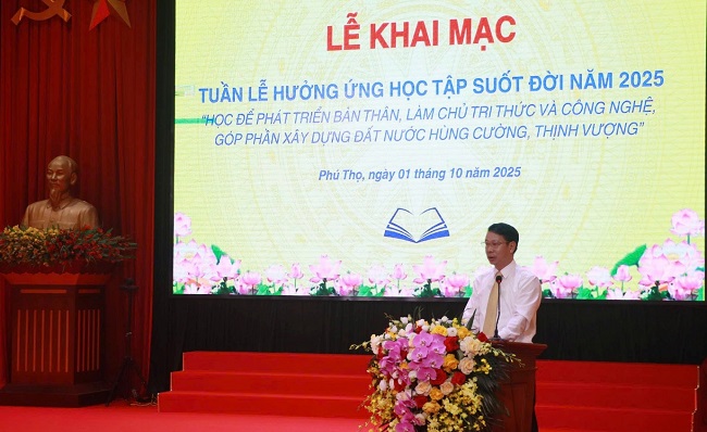 Sáng nay, ngày 01/10/2025 Uỷ ban nhân dân tỉnh Phú Thọ tổ chức Lễ khai mạc Tuần lễ hưởng ứng học tập suốt đời năm 2025 với chủ đề: “Học để phát triển bản thân, làm chủ tri thức và công nghệ, góp phần xây dựng đất nước hùng cường, thịnh vượng”; chào mừng thành công Đại hội đại biểu Đảng bộ tỉnh Phú Thọ lần thứ I, nhiệm kỳ 2025 - 2030 và hưởng ứng Đại hội Thi đua yêu nước tỉnh Phú Thọ lần thứ I, giai đoạn 2025-2030. Đây là sự kiện ý nghĩa được tổ chức trên phạm vi toàn quốc theo chỉ đạo của Bộ Giáo dục và Đào tạo.