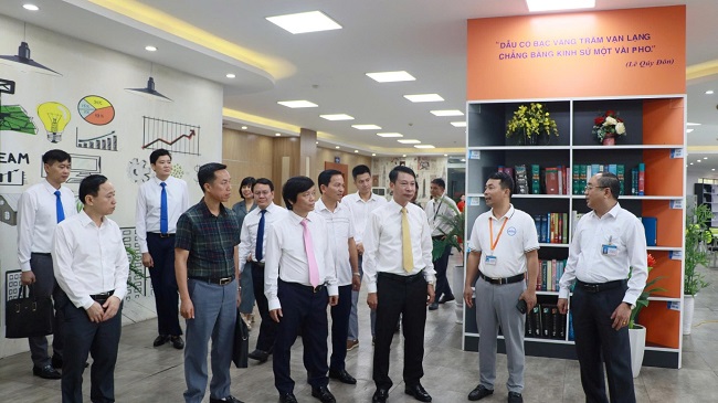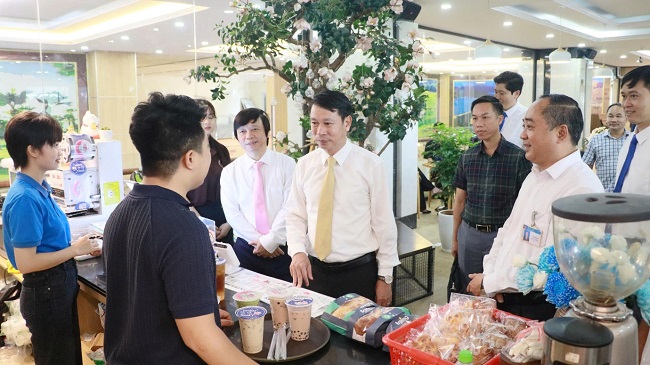 Đồng chí Phó Chủ tịch UBND tỉnh Nguyễn Khắc Hiếu cùng các đại biểu tham quan mô hình chuyển đổi số, ứng dụng công nghệ trong quản lý, dạy và học tại Trường Đại học Hùng Vương