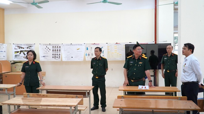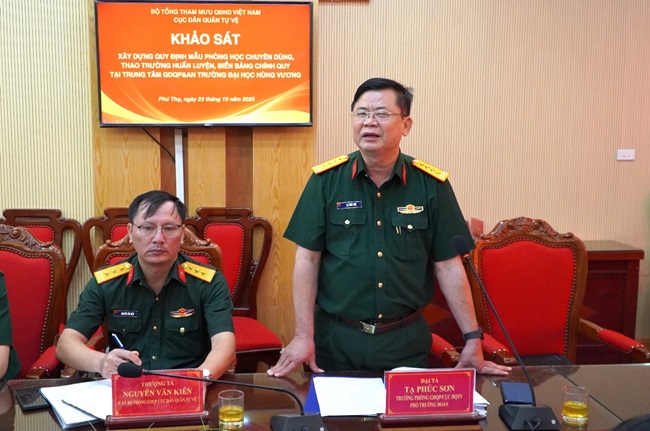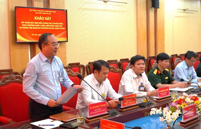 Phát biểu tại buổi làm việc, Đại tá Tạ Phúc Sơn, Trưởng phòng Giáo dục quốc phòng Cục Dân quân Tự vệ - Trưởng đoàn đánh giá cao sự chủ động, nghiêm túc của Trường Đại học Hùng Vương trong công tác xây dựng và duy trì môi trường giáo dục Quốc phòng - An ninh chính quy, hiện đại. Đồng chí khẳng định chương trình khảo sát thực tế này là cơ sở quan trọng để Trường Đại học Hùng Vương tiếp tục hoàn thiện các điều kiện về xây dựng quy định mẫu phòng học chuyên dùng, thao trường huấn luyện, biển bảng chính quy… nhằm nâng cao chất lượng đào tạo GDQP&AN cho sinh viên.