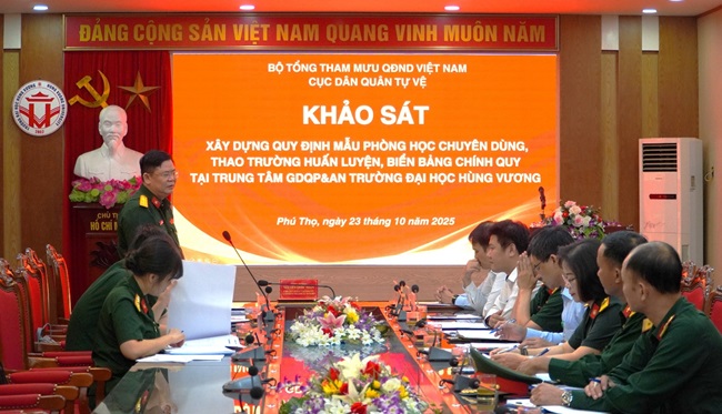 Sáng nay, ngày 23/10/2025 Trường Đại học Hùng Vương đón tiếp và làm việc với đoàn công tác Cục Dân quân Tự vệ, Bộ Quốc phòng về khảo sát xây dựng quy định mẫu phòng học chuyên dùng, thao trường huấn luyện, biển bảng chính quy của Trung tâm GDQP&AN Nhà trường.