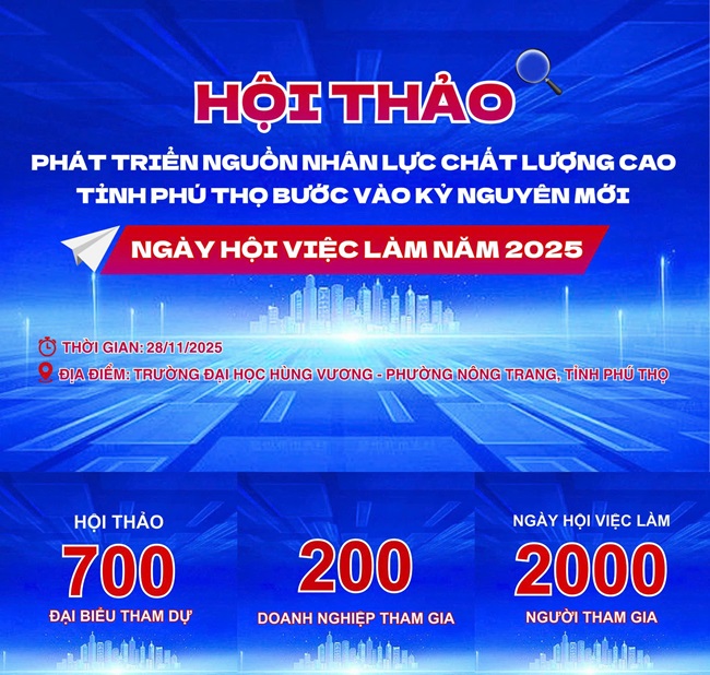 Ngày 28/11/2025 tại Trường Đại học Hùng Vương, tỉnh Phú Thọ sẽ diễn ra sự kiện Hội thảo “Phát triển nguồn nhân lực chất lượng cao tỉnh Phú Thọ bước vào kỷ nguyên mới và Ngày hội Việc làm năm 2025” - đây là sự kiện quy mô lớn của tỉnh Phú Thọ sau sáp nhập ba tỉnh (Phú Thọ, Vĩnh Phúc, Hoà Bình) với mục đích tăng cường kết nối “Chính quyền - Nhà trường - Doanh nghiệp - Người lao động” nhằm xây dựng thị trường lao động hiện đại, bền vững.