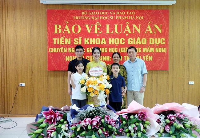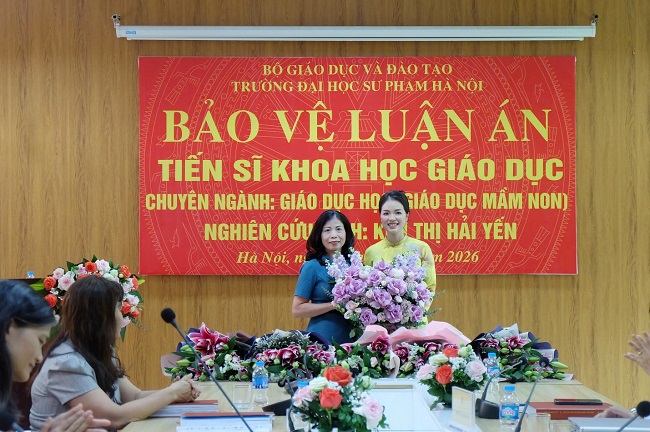 Sáng ngày 09/4/2026, tại Trường Đại học Sư phạm Hà Nội, Nghiên cứu sinh (NCS) Kim Thị Hải Yến - Giảng viên Khoa Giáo dục Tiểu học và Mầm non Trường Đại học Hùng Vương đã bảo vệ thành công luận án Tiến sĩ với đề tài: “Giáo dục kĩ năng giao tiếp tiếng Việt cho trẻ mẫu giáo lớp ghép vùng dân tộc thiếu số thông qua chơi” dưới sự hướng dẫn của PGS.TS Nguyễn Hiệp Thương - Trường Đại học Công đoàn, PGS.TS Bùi Thị Lâm - Hiệu trưởng Trường Khoa học Phát triển trẻ thơ, Trường ĐHSP Hà Nội.