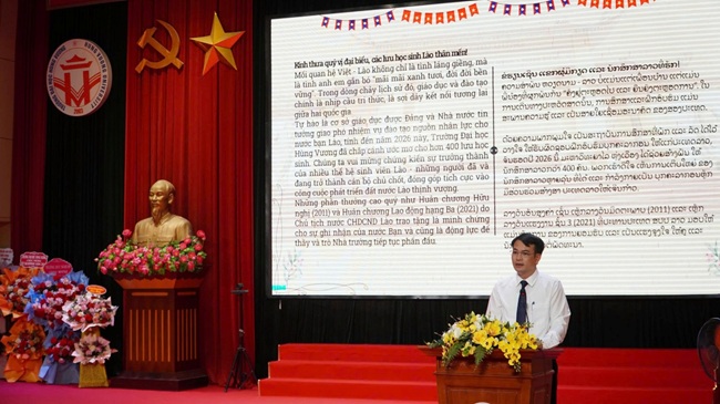 Phát biểu tại chương trình, TS. Trần Đình Chiến – Phó Hiệu trưởng thay mặt Đảng ủy, Ban Giám hiệu Trường Đại học Hùng Vương gửi tới các quý đại biểu, các thầy cô giáo và đặc biệt là toàn thể các em Lưu học sinh Lào lời chúc tốt đẹp nhất nhân sự kiện trọng đại này. Đồng chí Phó Hiệu trưởng nhấn mạnh rằng, sự kiện Tết cổ truyền Bunpimay năm 2026 trở nên đặc biệt khi diễn ra vào dịp cả dân tộc Việt Nam thành kính hướng về cội nguồn trong dịp Giỗ Tổ Hùng Vương ngày mùng 10 tháng 3 (Âm lịch). Sự giao thoa giữa hai nền văn hóa, giữa hai ngày lễ trọng đại này là minh chứng sống động cho sự tương đồng về tâm hồn, lòng biết ơn tiên tổ và khát vọng hòa bình của hai dân tộc Việt - Lào anh em. Đồng chí Phó Hiệu trưởng khẳng định rằng Trường Đại học Hùng Vương cam kết luôn tạo mọi điều kiện tốt nhất để các em yên tâm học tập, rèn luyện và phát triển toàn diện. Đồng thời, đồng chí hy vọng rằng các cán bộ, LHS Lào sẽ luôn giữ mãi ngọn lửa nhiệt huyết, học tập và rèn luyện tốt, mang kiến thức đã tiếp thu được đóng góp cho quê hương và góp phần vun đắp mối quan hệ hữu nghị đặc biệt Việt Nam - Lào mãi mãi trường tồn.