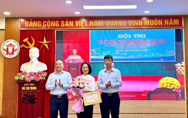 Đồng chí Hoàng Công Kiên - Bí thư Đảng ủy và đồng chí Đỗ Khắc Thanh - Phó Bí thư Đảng ủy, Hiệu trưởng Nhà trường trao giấy khen và phần thưởng cho đồng chí Phạm Thị Minh Thùy - Phó Chánh Văn phòng tại chương trình